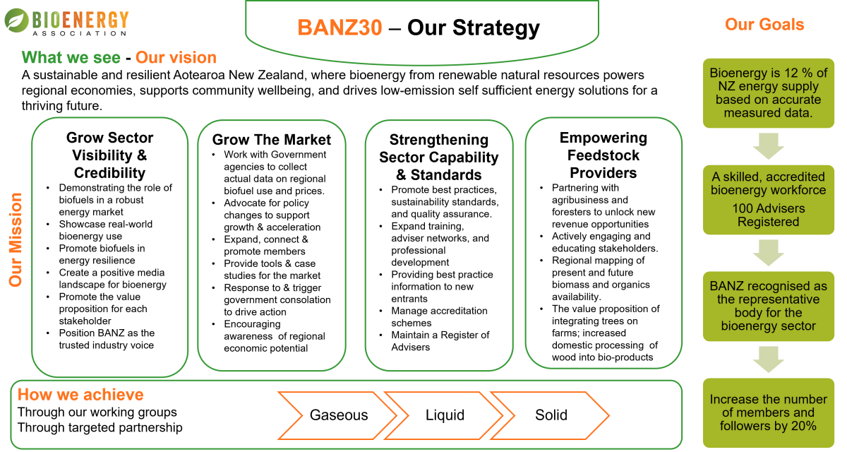 With NZ Government not having an Energy Strategy Bioenergy Association has been leading implementation of a Vision and Strategy (BANZ30) developed across the whole of the NZ economy. Priorities are on utilising biomass and organic waste material to produce energy. (click on image to view full size)